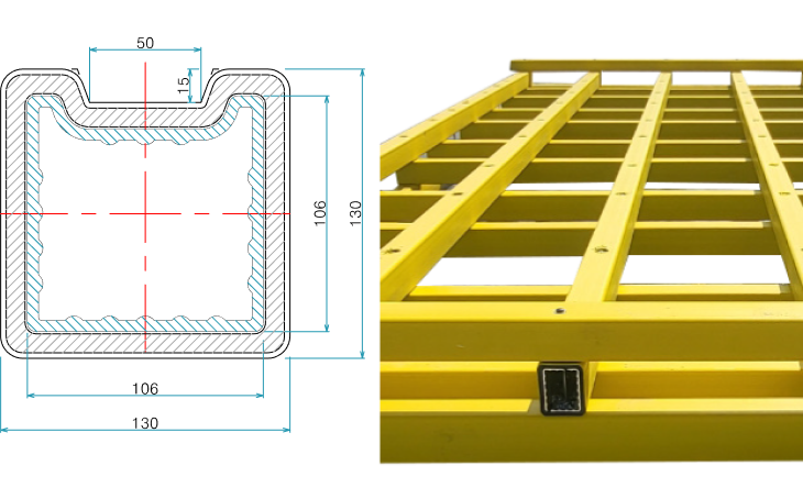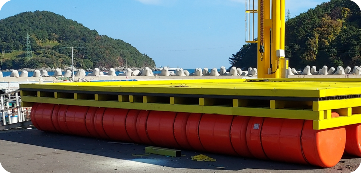 This four-sided support is used as a four-sided pipe to connect the landing pad upper deck, horizontal and vertical supports, and buoys, and depending on application, PE four-sided pipe or AI-reinforced PE four-sided pipe can be chosen. To strengthen the support, AL special steel is inserted into the PE material, making it appropriate for use with heavy cargo barges.